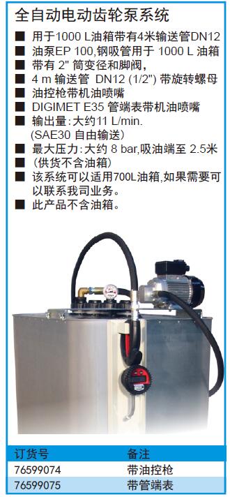 ·用于1000L油箱带有4米输送管DN12 ·油泵EP100,钢吸管用于1000L油箱 ·带有2"筒变径和脚阀, ·4m输送管DN12(1/2")带旋转螺母 ·油控枪带机油喷嘴 ·DIGIMETE35管端表带机油喷嘴 ·输出量:大约11L/min.(SAE30自由输送) ·最大压力:大约8bar,吸油端至2.5米 ·(供货不含油箱) ·该系统可以适用700L油箱,如果需要可以联系我司业务。 ·此产品不含油箱。