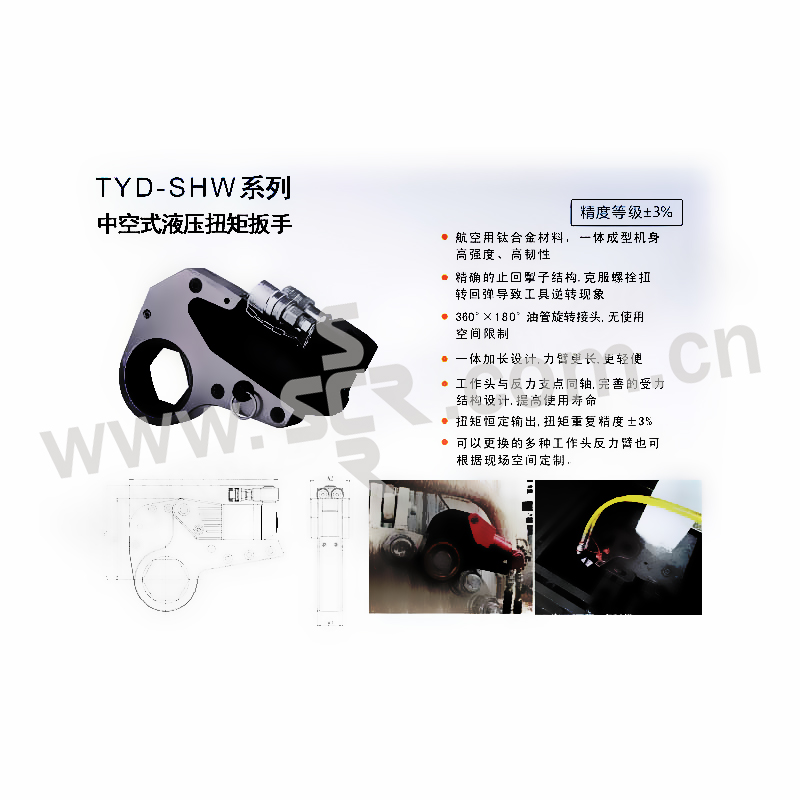 ·航空用钛合金材料,一体成型机身高强度,高韧性·精准的止回掣子结构,克服螺栓扭转回弹法制工具逆转现象·360*180油管旋转接头,无使用空间限制·一体加长设计,力臂更长,更轻便·工作头与返力支点同轴,完善的手里结构设计,提高使用寿命·扭矩恒定输出,扭矩重复精度±3%·可以更换多种工作头反臂力也可以根据现场空间定制
