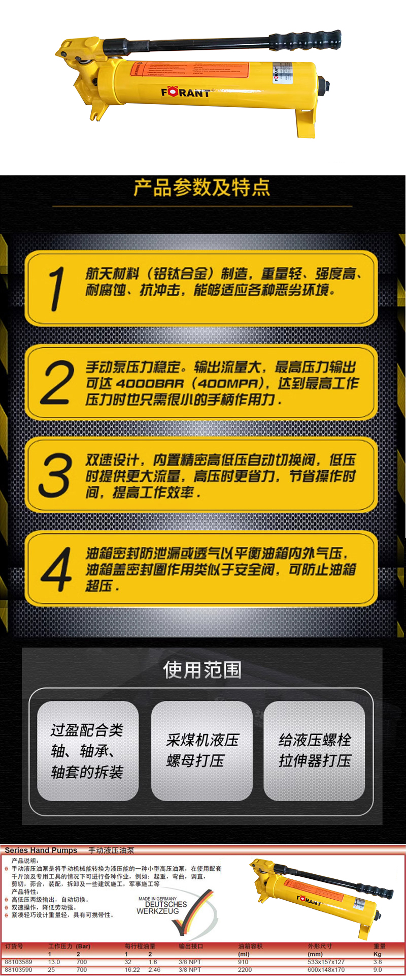 ·手动液压油泵是将手动机械能转换为液压能的一种小型高压油泵,在使用配套千斤顶及专用工具的情况下可进行各种作业,