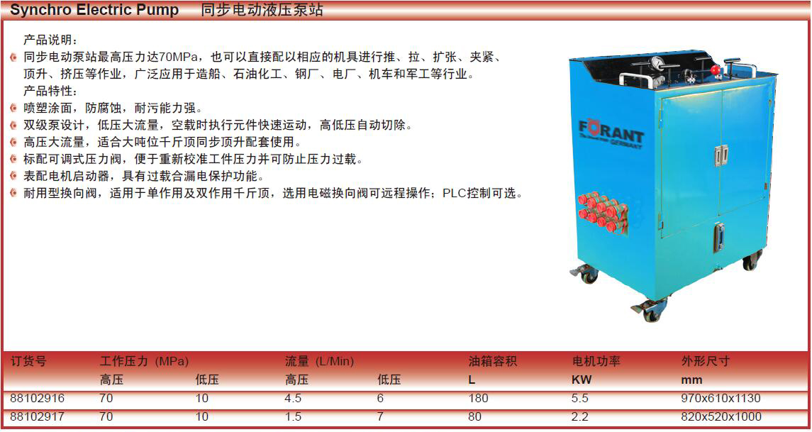·同步电动泵站最高压力达70MPa,也可以直接配以相应的机具进行推、拉、扩张、夹紧、顶升、挤压等作业 ·产品特性: ·喷塑涂面,防腐蚀,耐污能力强。 ·双级泵设计,低压大流量,空载时执行元件快速运动,高低压自动切除。 ·高压大流量,适合大吨位千斤顶同步顶升配套使用。 ·标配可调式压力阀,便于重新校准工件压力并可防止压力过载。 ·表配电机启动器,具有过载合漏电保护功能。 ·耐用型换向阀,适用于单作用及双作用千斤顶,·选用电磁换向阀可远程操作;PLC控制可选。