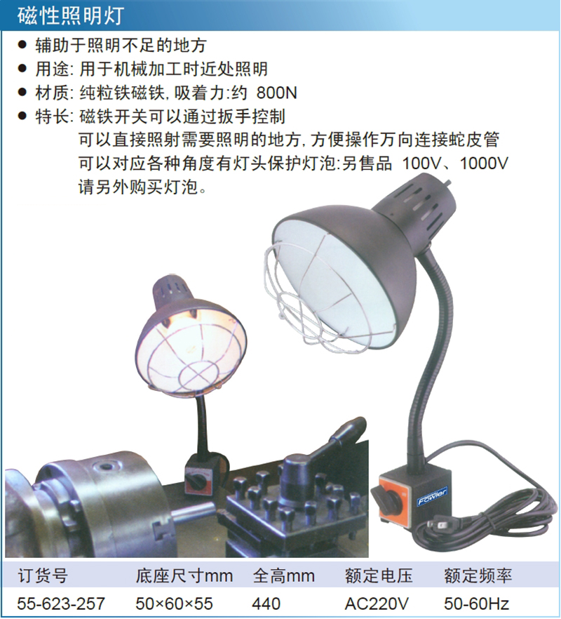·辅助于照明不足的地方 ·材质: 纯粒铁磁铁,吸着力:约 800N ·特长: 磁铁开关可以通过扳手控制 ·可以直接照射需要照明的地方,方便操作万向连接蛇皮管 ·可以对应各种角度有灯头保护灯泡:另售品 100V、1000V ·请另外购买灯泡。