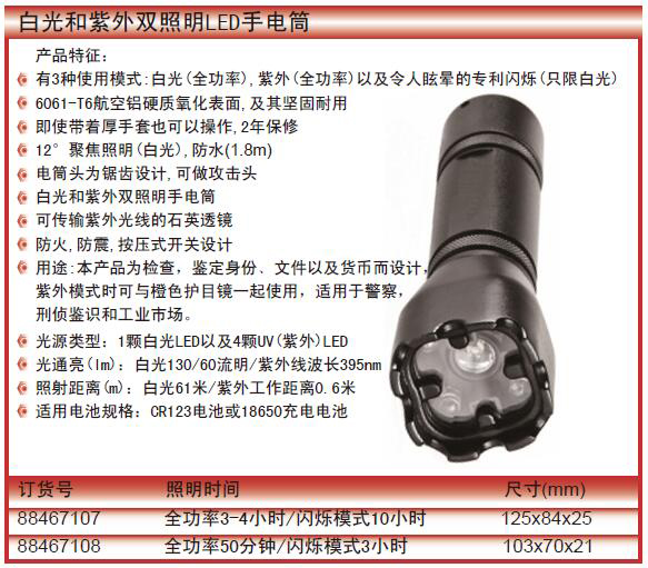 ·有3种使用模式:白光(全功率),紫外(全功率)以及令人眩晕的专利闪烁(只限白光) ·6061-T6航空铝硬质氧化表面,及其坚固耐用 ·即使带着厚手套也可以操作,2年保修 ·12°聚焦照明(白光),防水(1.8m) ·电筒头为锯齿设计,可做攻击头 ·白光和紫外双照明手电筒 ·可传输紫外光线的石英透镜 ·防火,防震,按压式开关设计