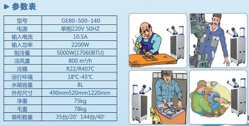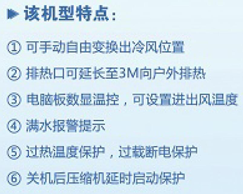 ·可手动自由变换出冷风位置 ·排热口可延长至3M向户外排热 ·电脑板数显温控,可设置进出风温度 ·过热温度保护,过载断电保护 ·关机后压缩机延时启动保护