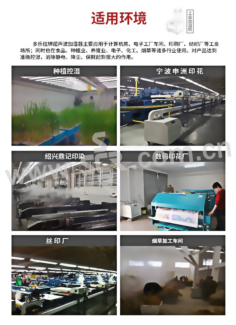 ·超声波加湿机适用范围:实验室加湿,蔬果保鲜加湿,冷库加湿,光伏固化室加湿,电子防静电加湿,纺织防断线加湿,车间降低粉尘加湿,食用菌加湿,烟草回潮加湿,珍珠棉加湿,印刷加湿,手套车间加湿,动物养殖场消毒加湿,动物孵化加湿··