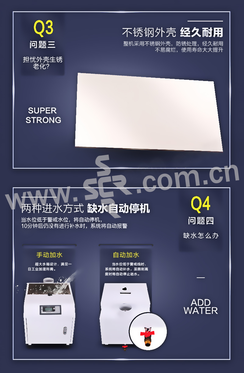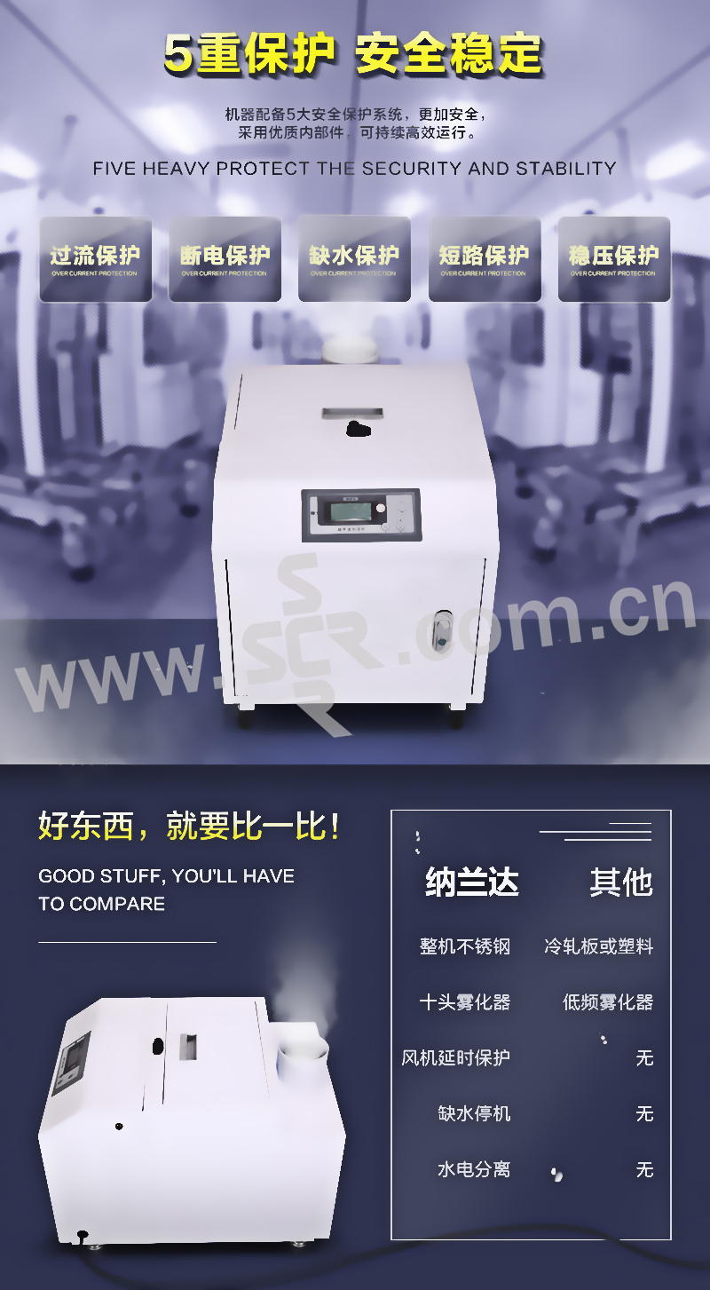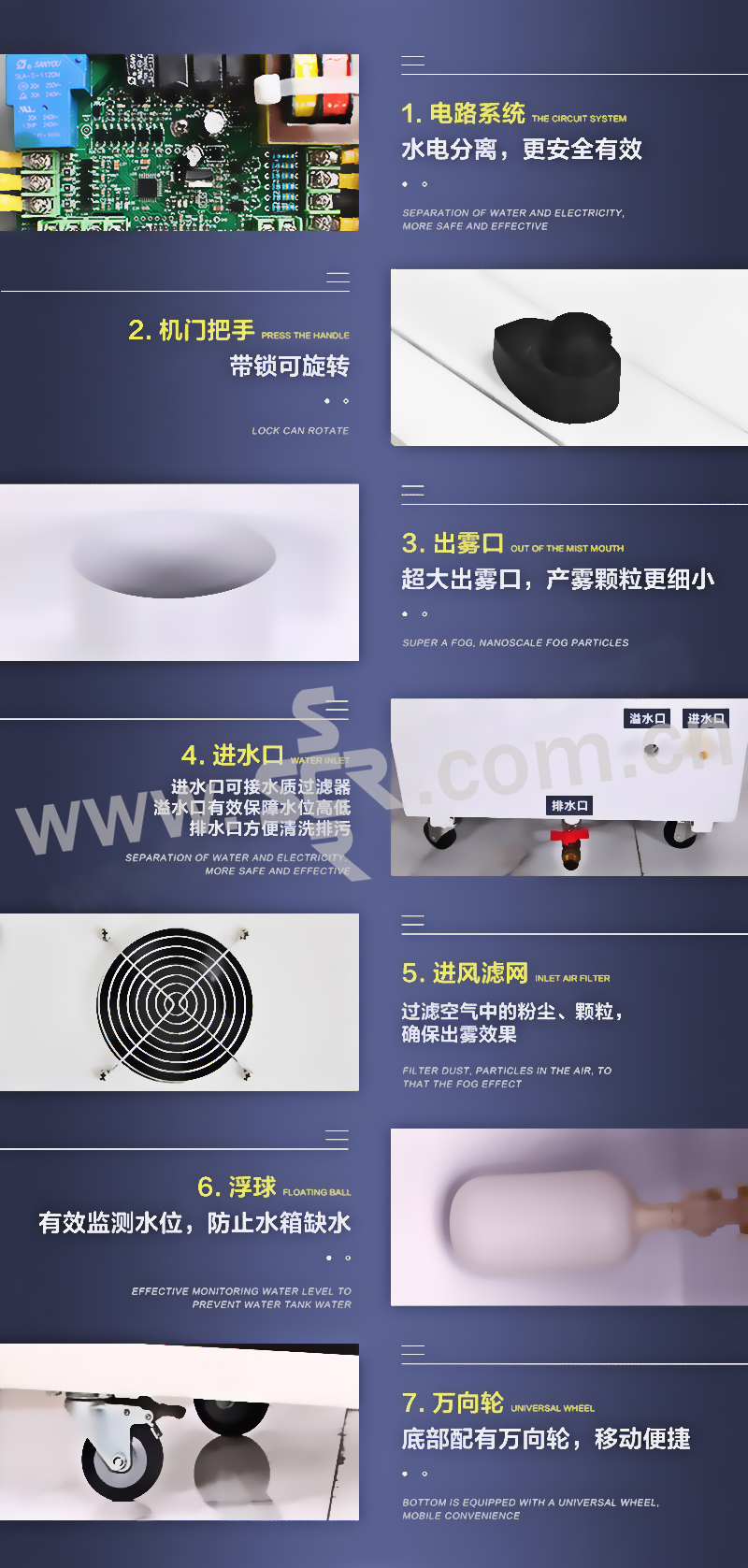 ·人性化工业设计进水口·进水口可接水质过滤器;溢水口有效保障水位高低;排水口方便清洗排污。·大出雾口,只需简单组装管子,便可使用。·过滤器特有过滤器设计,防止水中杂质进入,避免影响电子器件使用寿命。·湿度传感器插口·随机配置湿度传感器可插入插口,随时检测当前环境湿度。·万向轮底座,优质万向轮,自带锁扣,拉下锁扣,便可锁住机身移动。想移动想固定,使用灵活自如。