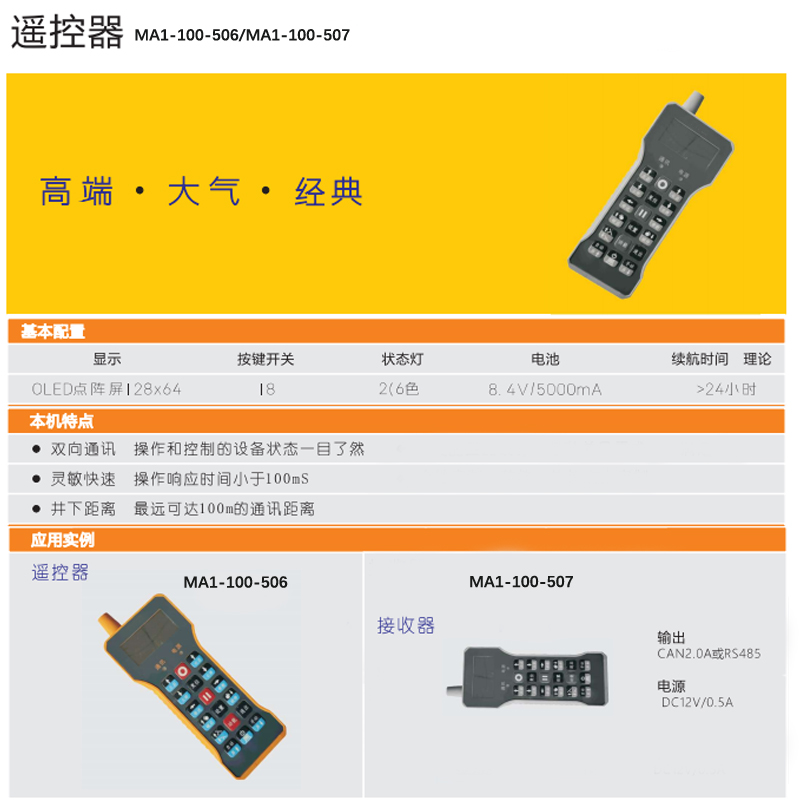 ·集发射、接收和操作站功能于一体,工作状态智能切换。 ·井下50~200米可选 ·OLED良好的夜视和强光显示效果 ·发送和接收双向通讯 ·整体防水设计,满足IP65标准
