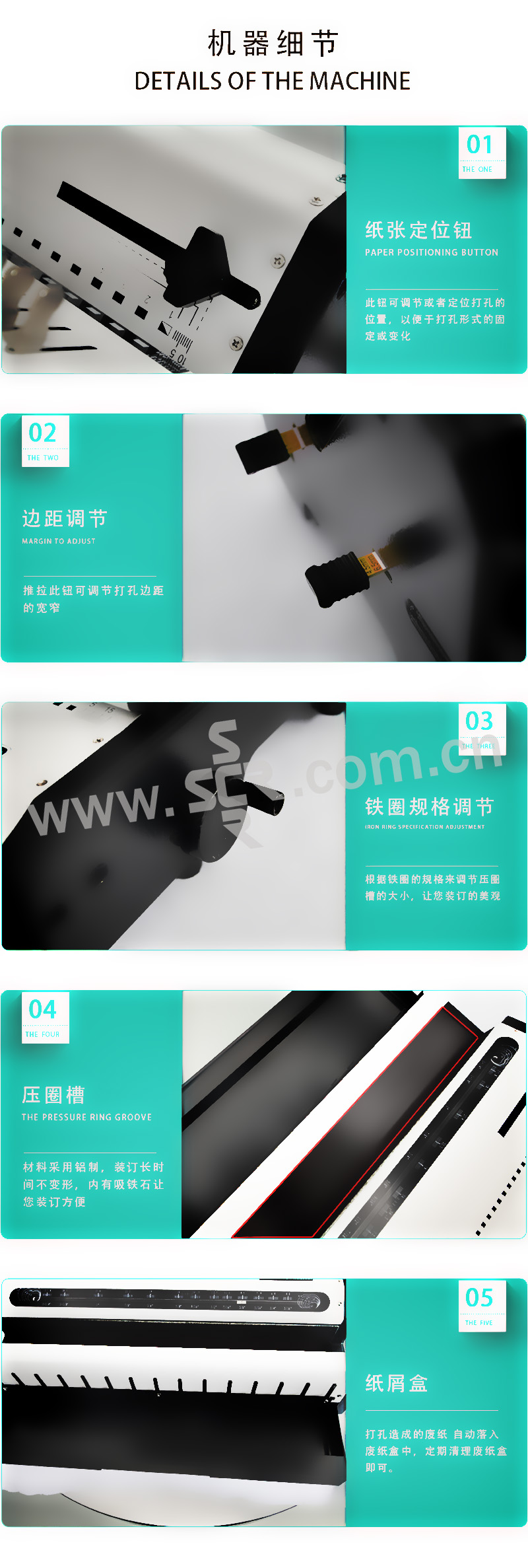 ·功能参数:·金属机身:精钢机身结构,铁质白色面板,时尚大方·精刚刀片:上下刀口均选用高级精致钢材,先进技术工艺铸造,刀片锋利耐用,打孔不起毛边,加之蘸火处理,增加打孔的硬度,使用寿命可达上万次·抽拔刀设计:打孔刀均可抽拔,可根据制作需求进行打孔·超厚打孔设计:机器可以满足一次打孔20(80g)/25张(70g)的超大厚度,充分满足了客户的打孔需求·省力打孔设计:采用加长手柄,符合杠杆设计原理,使用省时省力·定位按钮设计:有效固定资料的打孔位置,
