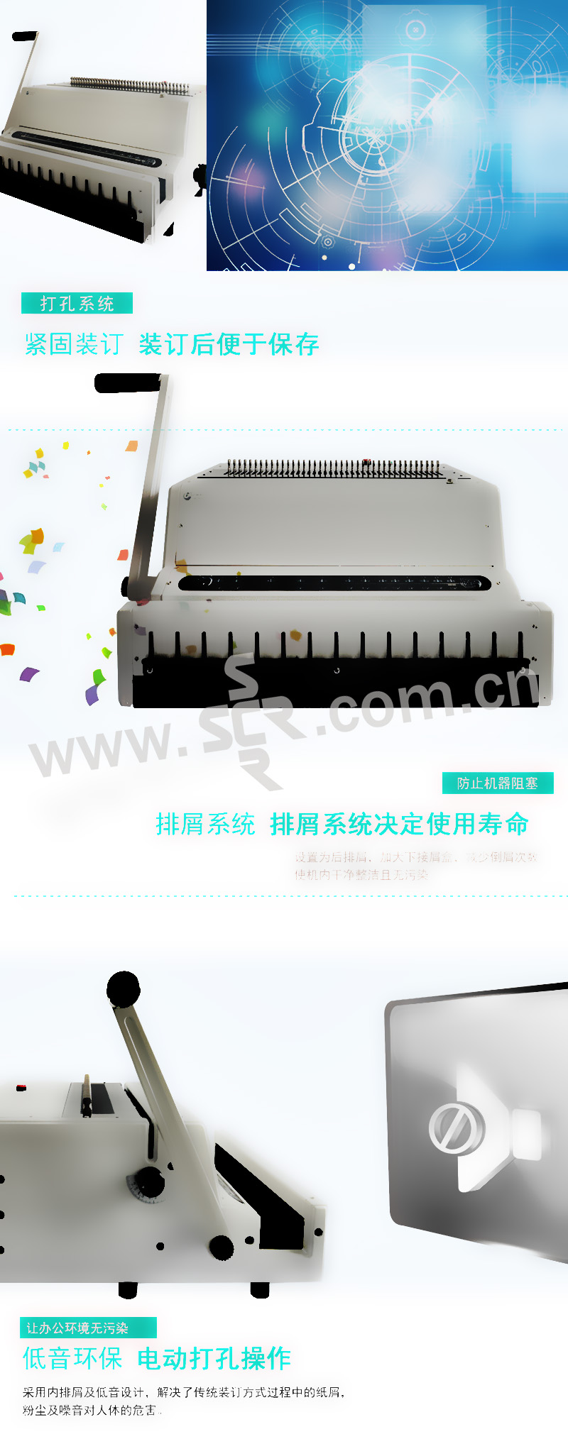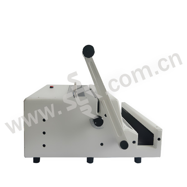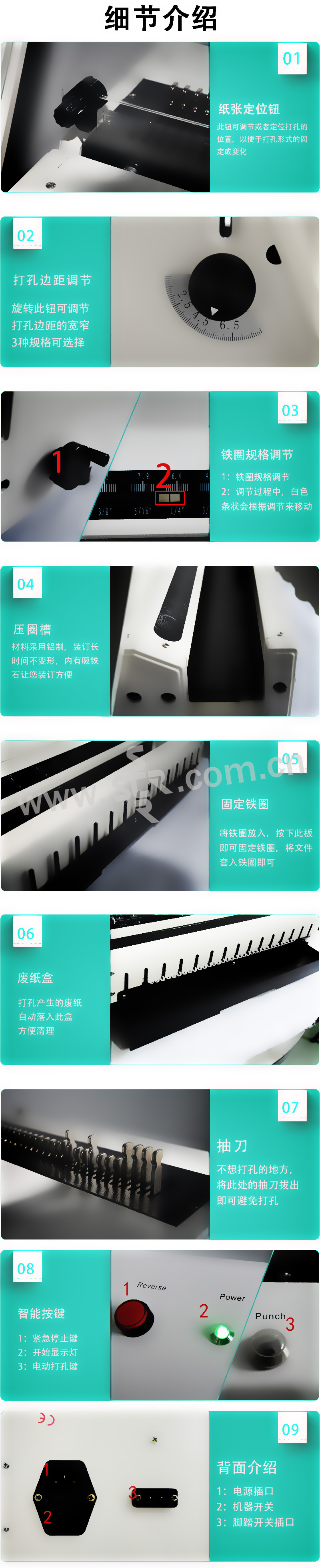 ·将装订机放置于可靠的工作台上。·将压环手柄装入右侧的主轴上,再将手柄旋钮拧入主轴上·将脚踏开关插头插入脚踏开关插孔。·将机器插头擂入电源插孔内。将电源开关拔至1,开关内的灯亮。·按启动开关或踩动脚踏开关机器会进行打孔工作。·将去油纸从打孔入口推入进行多次打孔除掉刀具上的油渍。边距调节:左右拉动调距器可以调节打孔的边距位置调节:拧松调位器旋钮推动调位器。配合标尺和抽出抽刀块,可以打各种规格的纸张。打孔·根据纸张的规格