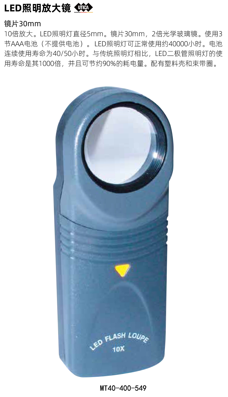 ·10倍放大。LED照明灯直径5mm。镜片30mm,2倍光学玻璃镜。使用3节AAA电池(不提供电池)。LED灯可正常使用约40000小时。电池连续使用寿命为40/50小时。与传统照明灯相比,LED二极管照明灯的使用寿命是其1000倍,并且可节约90%的耗电量。培有塑料壳和束带圈