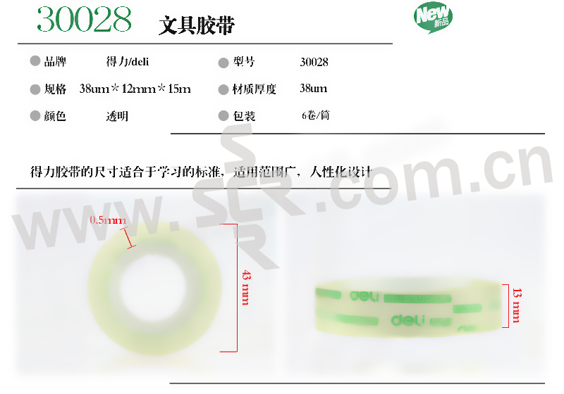 DELI/得力 学生胶带 30028 15m×12mm 透明 6卷装 1筒