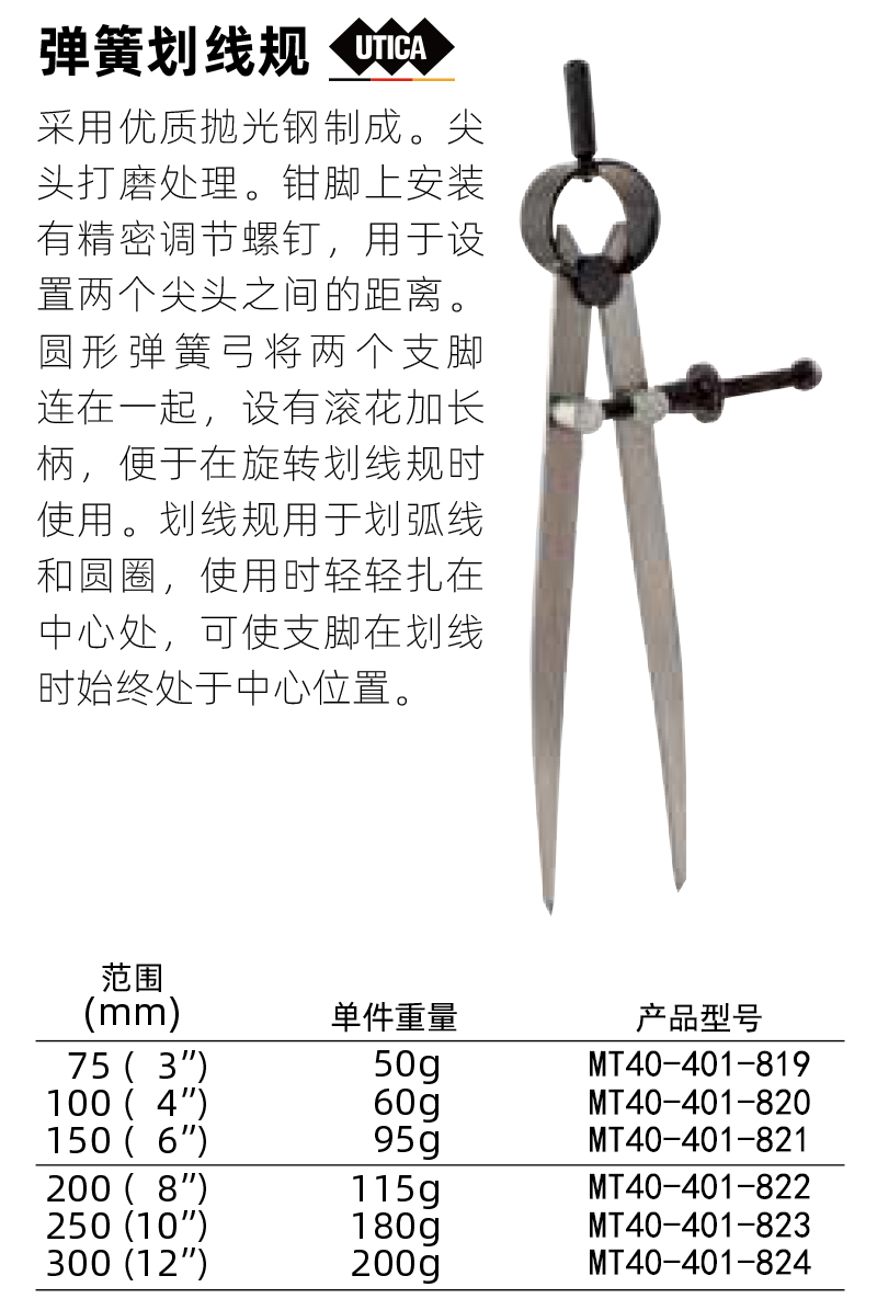 采用优质钢制成。尖头打磨处理。钳脚上安装有精密调节螺钉,用于设置两个尖头之间距离