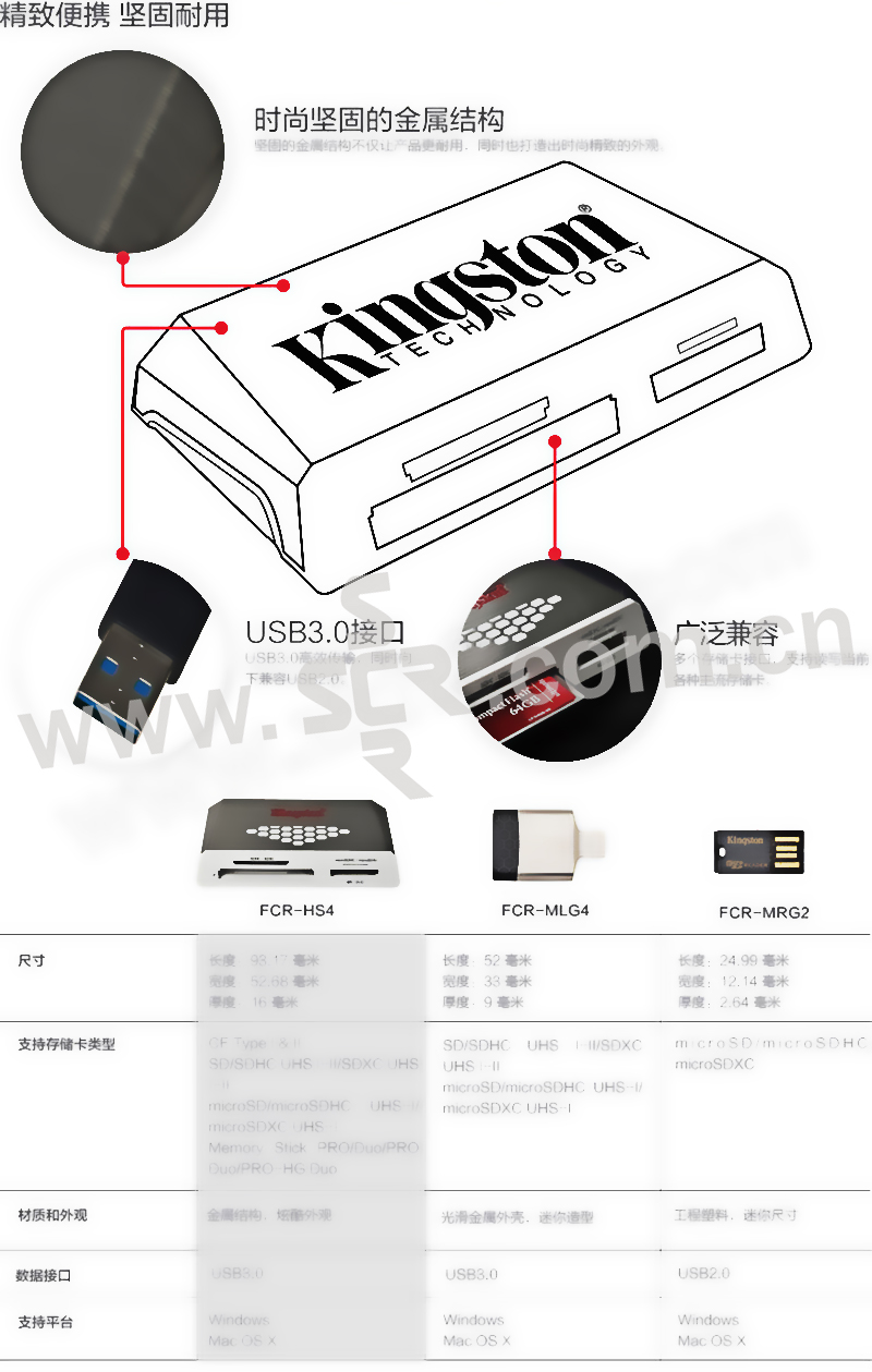 ·随着存储卡容量和文件大小的增加,您需要更加快速地传输数据,精巧耐用的金士顿 USB 3.0 High-Speed Media Reader (FCR-HS4)读卡器能帮助您在多个设备之间快速移动数据。 ·它拥有 USB3.0 的高性能,能快速读写存储卡里的海量数据,同时还可向下兼容 USB2.0,全面配合您的现有设备完成高效率的任务。