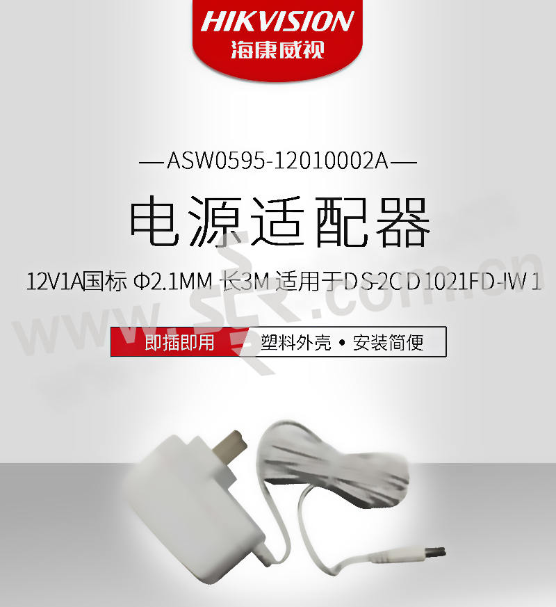 HIKVISION/海康威视 电源适配器 ASW0595-12010002A 12V1A 国标 φ2.1mm 长3m 适用于DS-2CD1021FD-IW1 1个