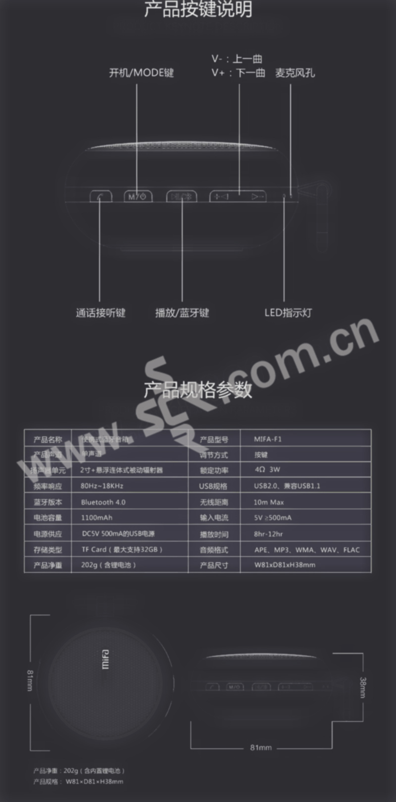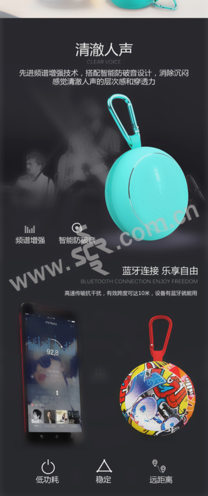 ·外观小巧、易携带,多种时尚色彩,支持与手机蓝牙无线连接,播放音乐、电影、游戏,让你的生活无限时尚,无线方便。
