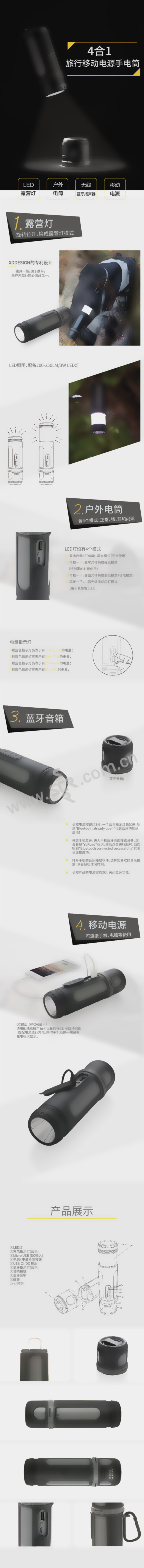 ·移动电源、无线蓝牙扬声器、野营灯、应急灯(含4个模式:正常,强、弱和闪烁)。