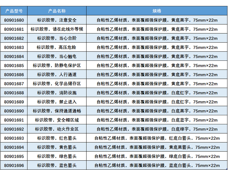 ·采用进口自粘性乙烯材质,表面覆超强保护膜,比一般普通标志胶带更加坚固耐用; ·可根据具体情况裁切张贴