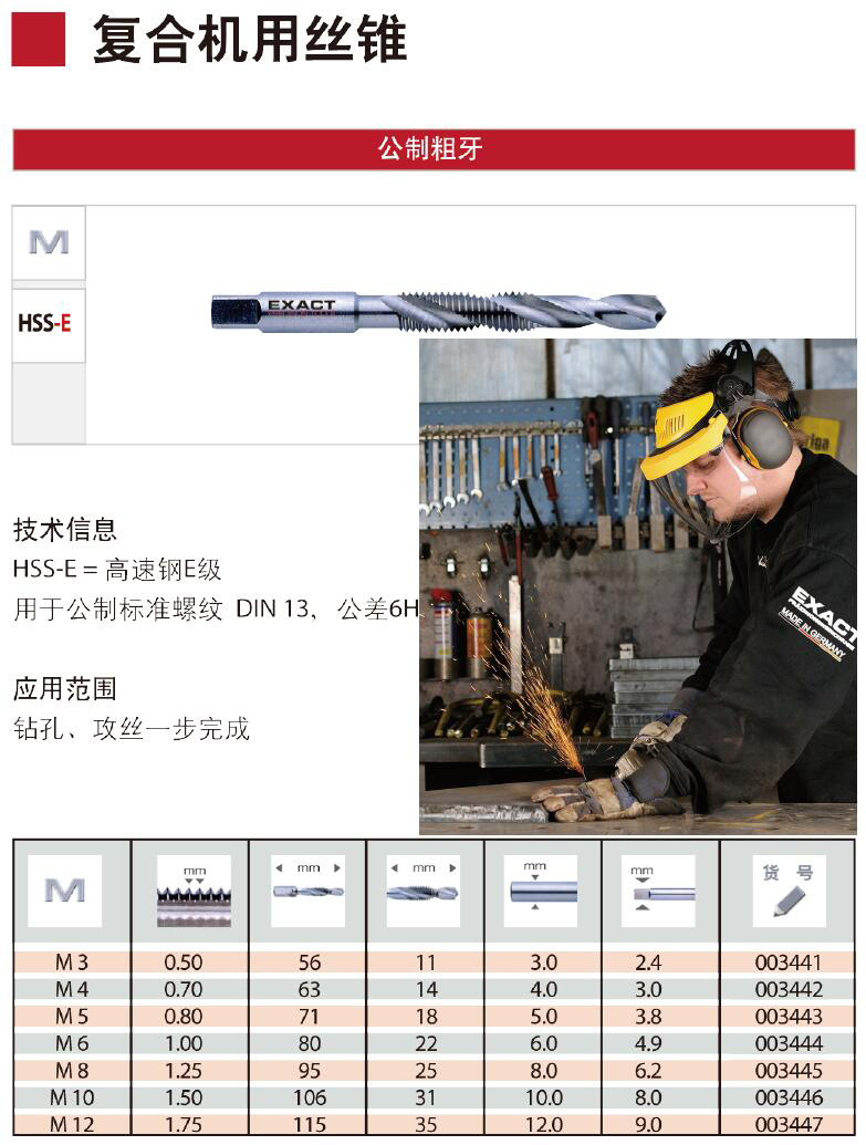 ·材质:HSS-E;用于公制标准螺纹DIN13,公差6H ·钻孔、攻丝一步完成