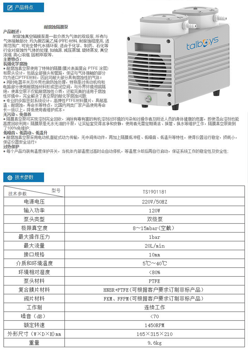 ·抗强化学腐蚀 ·无污染、免保养 ·低噪音、低震动 ·过热保护