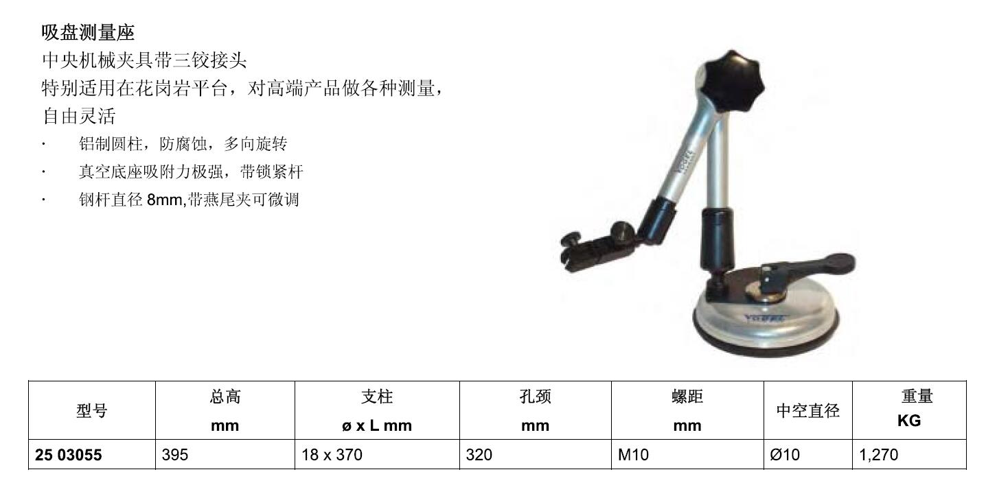 ·中央机械夹具带三饺接头 ·特别适用在花岗岩平台. ·对高端产品做各种测量. ·自由灵活 ·铝制圆柱. ·防腐蚀.多向旋转真空底座吸附力极强.带锁紧杆钢杆直径8mm.带燕尾夹可微调