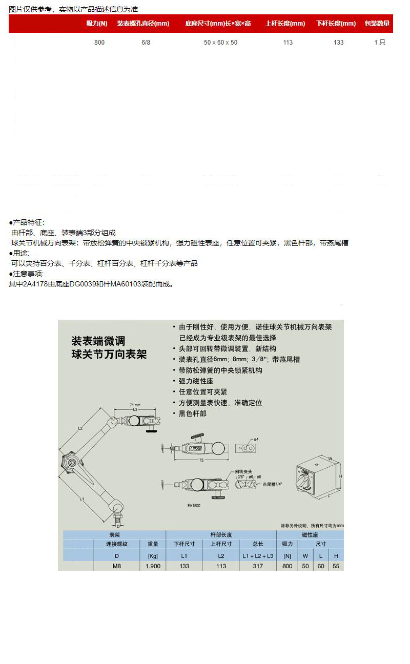 ·由杆部、底座、装表端3部分组成 ·球关节机械万向表架:带放松弹簧的中央锁紧机构,强力磁性表座,任意位置可夹紧,黑色杆部,带燕尾槽