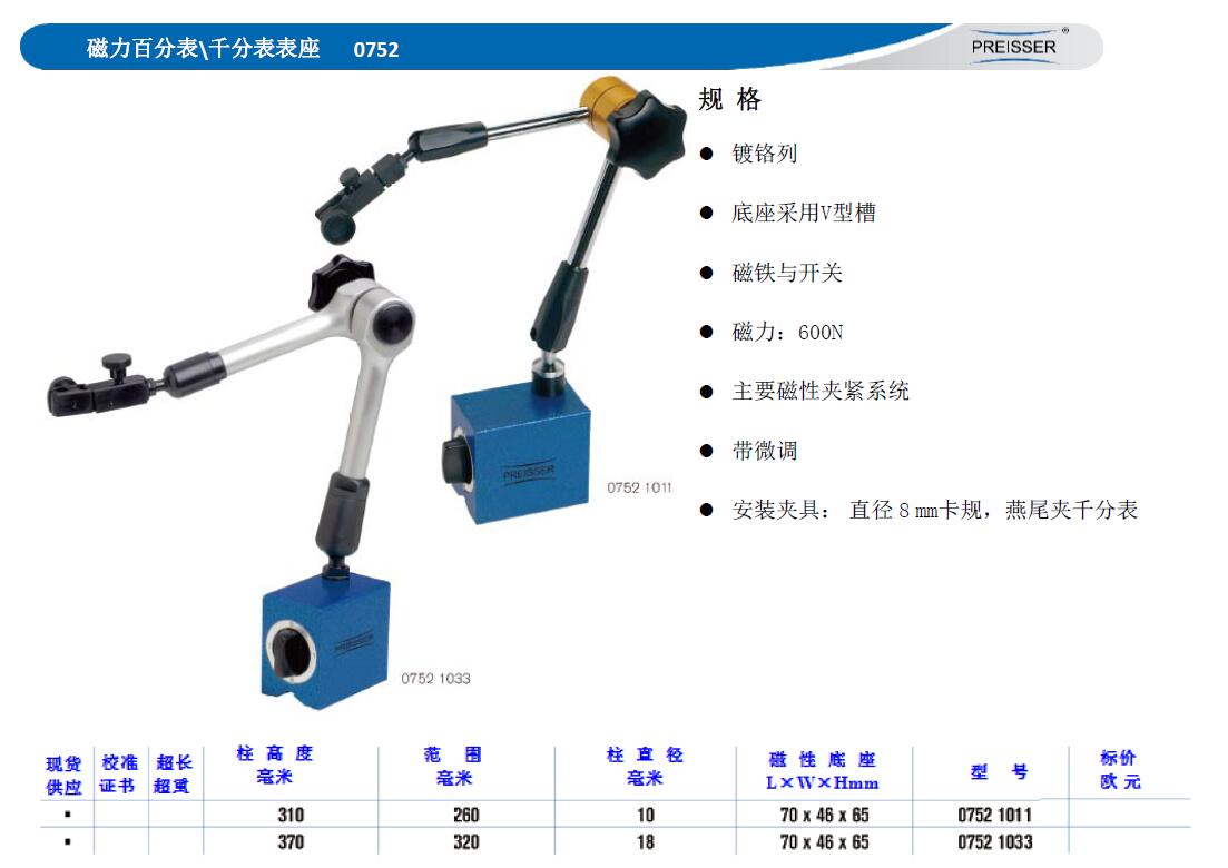 ·镀铬列 ·底座采用V型槽 ·磁铁与开关 ·磁力:600N ·主要磁性夹紧系统 ·带微调 ·安装夹具:直径8mm卡规,燕尾夹千分表