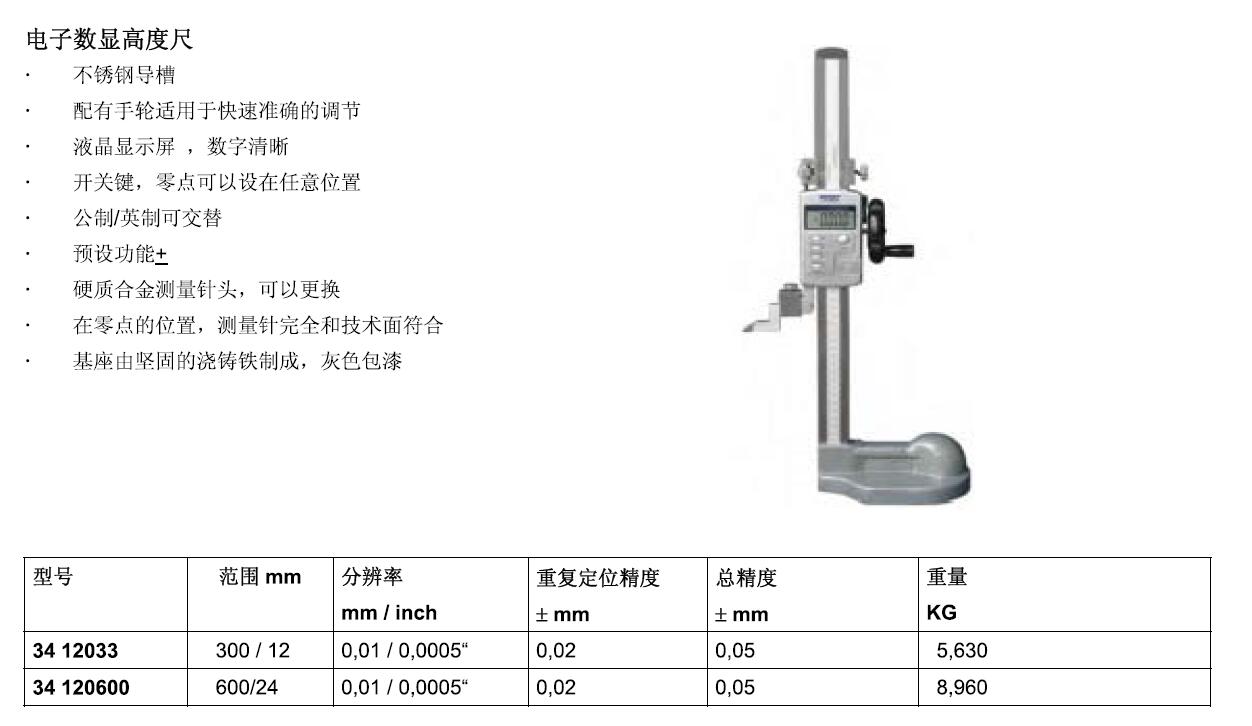 ·不锈钢导槽 ·配有手轮适用于快速准确的调节 ·液晶显示屏 .数字清晰 ·开关键. 零点可以设在任意位置 ·公制/英制可交替 ·预设功能± ·硬质合金测量针头. 可以更换 ·在零点的位置. 测晕针完全和技术面符合基座由坚固的浇铸铁制成. 灰色包漆