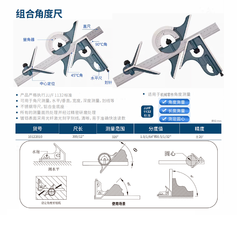 ? 产品严格执行JJ/F1132标准? 可用于角尺测量,水平/垂直,宽度,深度测量,划线等? 不锈钢导尺,铝合金底座? 所有的测量面热处理并经过精密研磨处理?镀铬表面采用光纤激光刻字刻线,清晰,易于准确快速读数