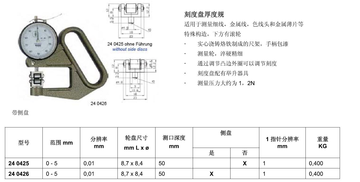 ·适用于测噩细线·金属线·色线头和金属薄片等特殊构造·下方有滚轮 ·实心浇铸烙铁制成的尺架·手柄包漆 ·测量轮·埣硬精细 ·通过调节凸边外圈可以调节刻度 ·刻度盘配有举升器具 ·测量压力大约为1·2N