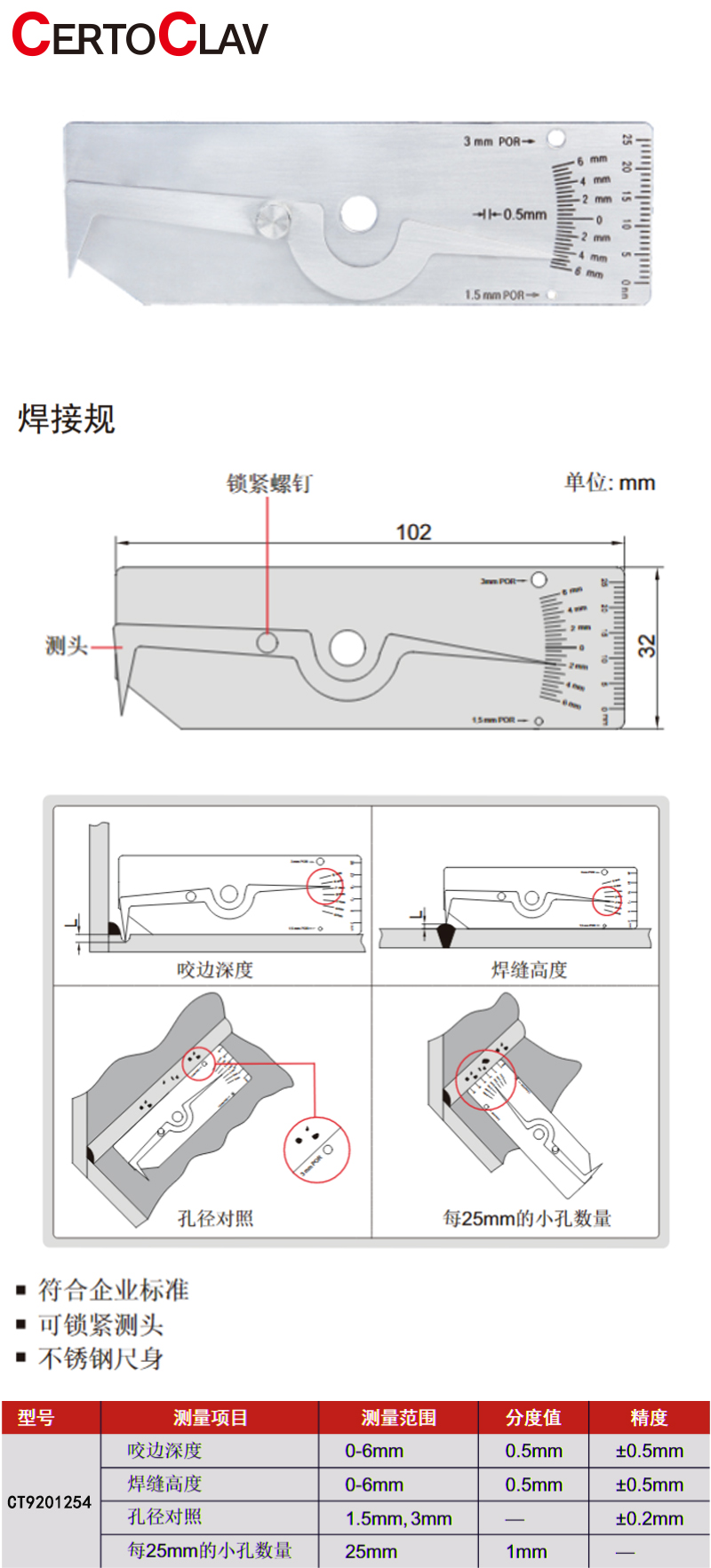 咬边深度:0~6mm 焊缝高度:0~6mm 孔径对照:1.5mm,3mm 每25mm的小孔数量:25mm