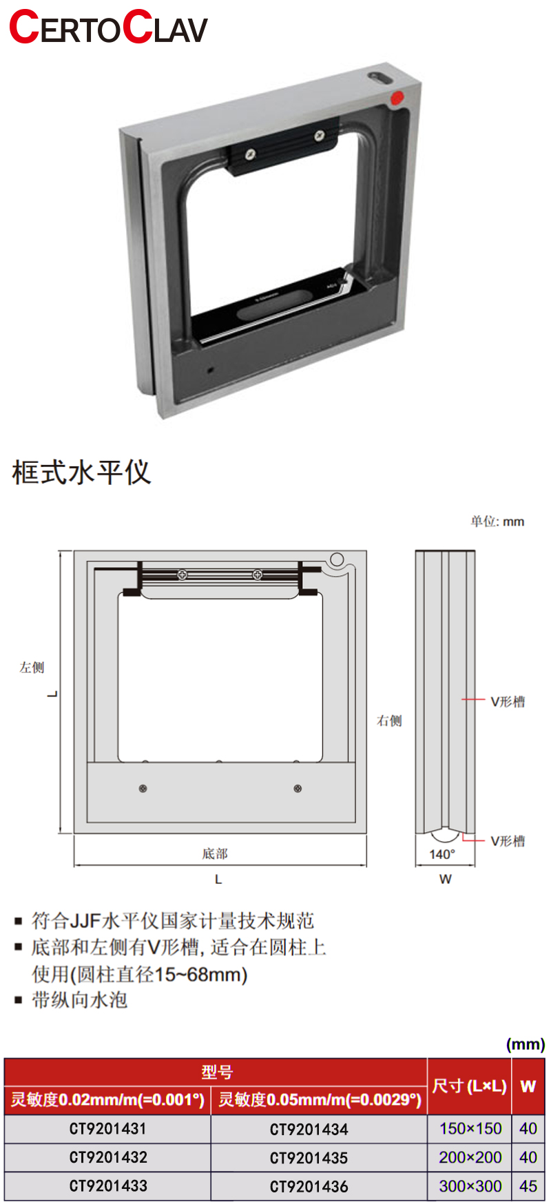 ·符合JJF水平仪国家计量技术规范; ·底部和左侧有V形槽,适合在圆柱上使用(圆柱直径15~68mm); ·带纵向水泡。