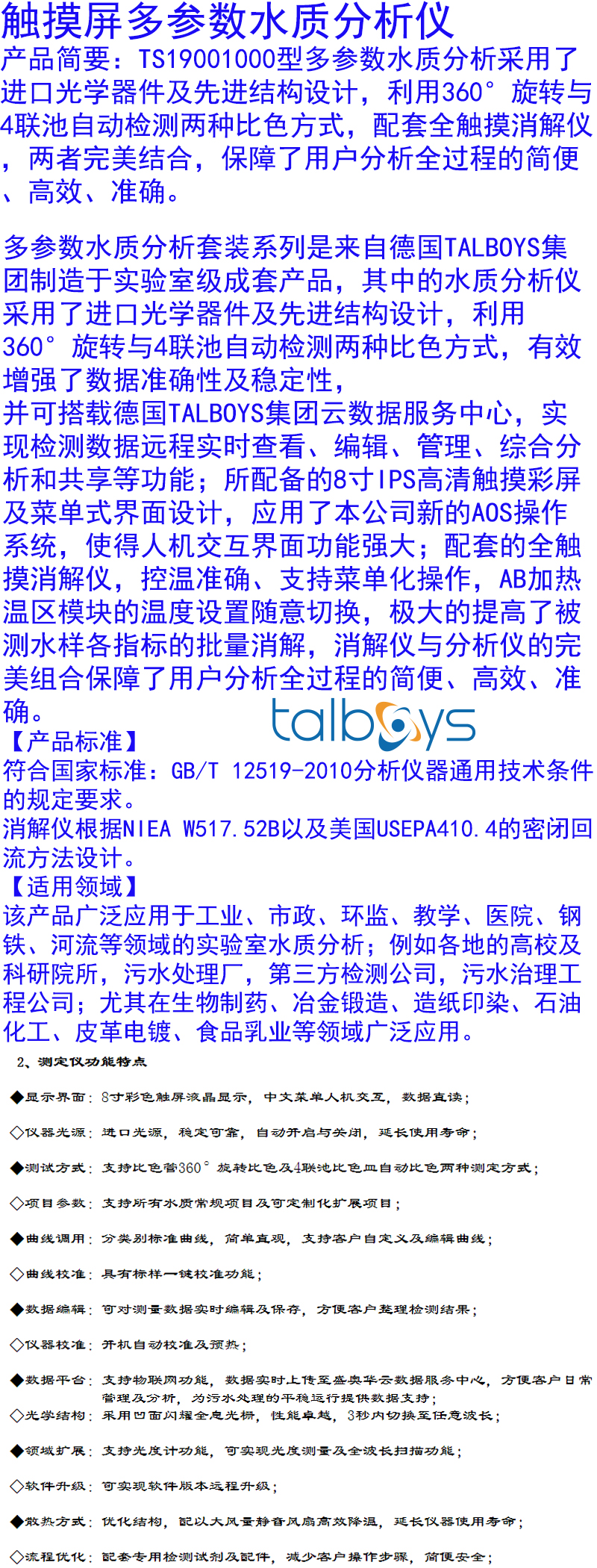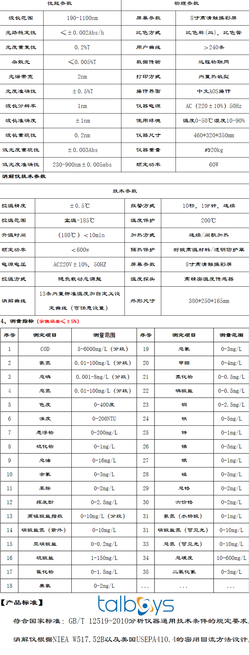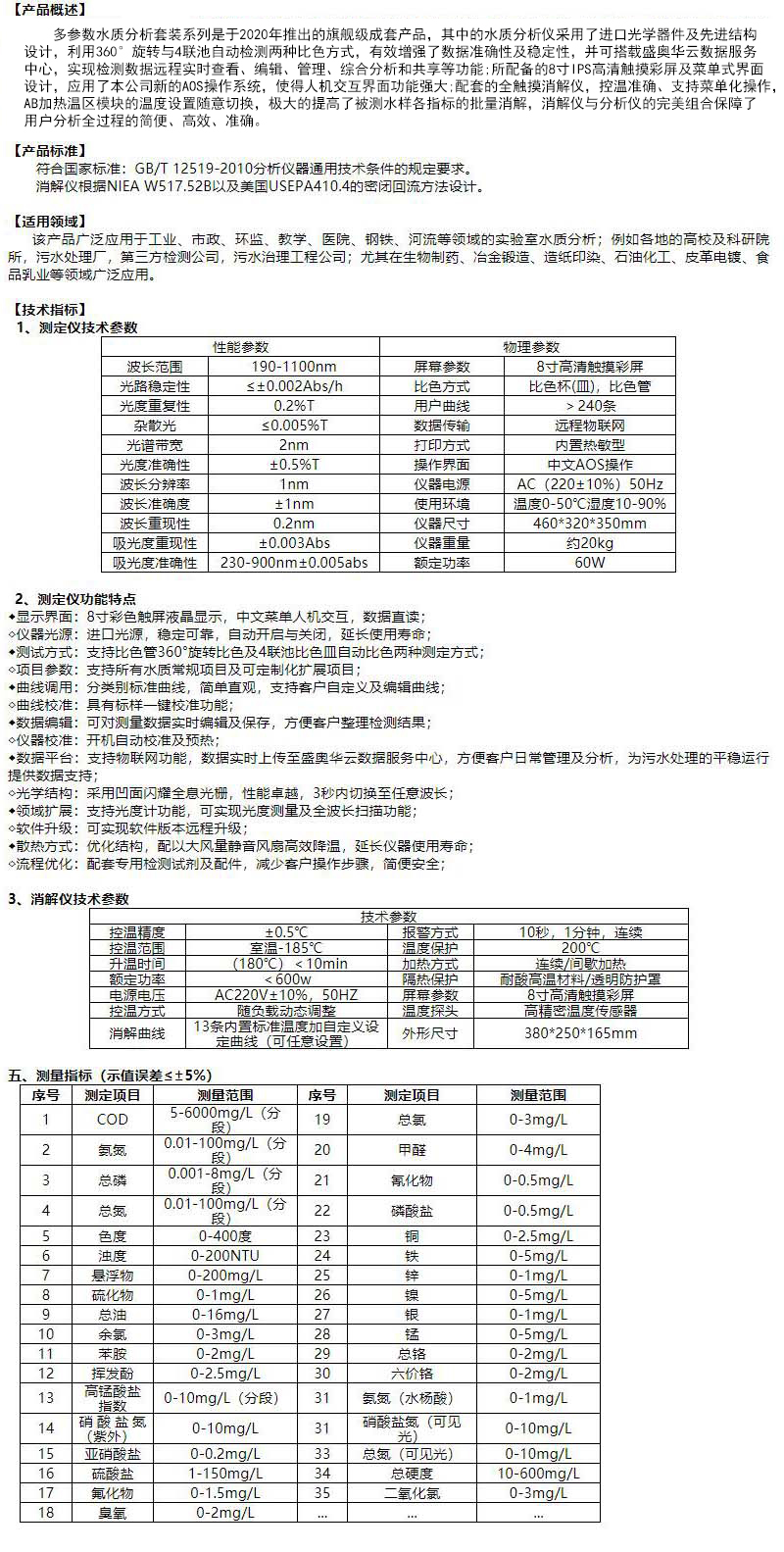 ·水质分析仪采用了进口光学器件及先进结构设计,利用360°旋转与4联池自动检测两种比色方式,有效增强了数据准确性及稳定性,并可搭载盛奥华云数据服务中心,实现检测数据远程实时查看、编辑、管理、综合分析和共享等功能;所配备的8寸IPS高清触摸彩屏及菜单式界面设计,应用了本公司新的AOS操作系统,使得人机交互界面功能强大;配套的全触摸消解仪,控温准确、支持菜单化操作,AB加热温区模块的温度设置随意切换,极大的提高了被测水样各指标的批量消解,消解仪与分析仪的完美组合保障了用户分析全过程的简便、高效、准确。