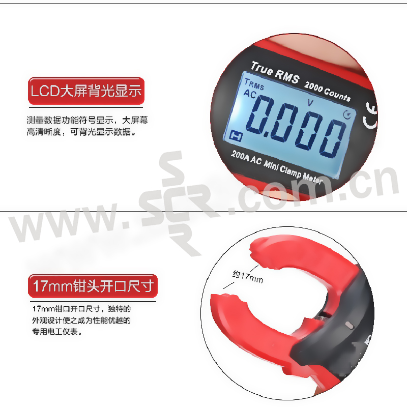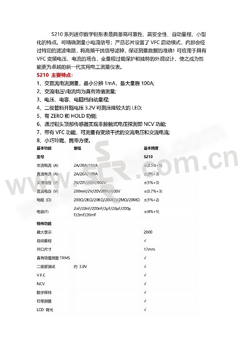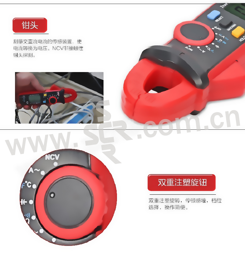 ·交直流电流测量,分辨1mA,量程100A。·交流电压\电流均为真有效值测量。·电压、电容、电阻档自动量程。·二极管档开路电压3.2V可测压降较大的LED。·有ZERO和HOLD功能。·通过钳头顶部传感器实现非接触式电压探测即NCV功能。·带有VFC功能,可测量有变频干扰的交流电压和交流电流。·小巧玲珑,携带方便