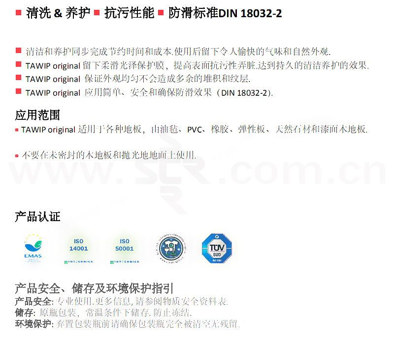 ·清洁和养护同步完成节约时间和成本.使用后留下令人愉快的气味和自然外观. ·留下柔滑光泽保护膜,提高表面抗污性弄脏.达到持久的清洁养护的效果 ·保证外观均匀不会造成多余的堆积和纹层 应用简单、安全和确保防滑效果