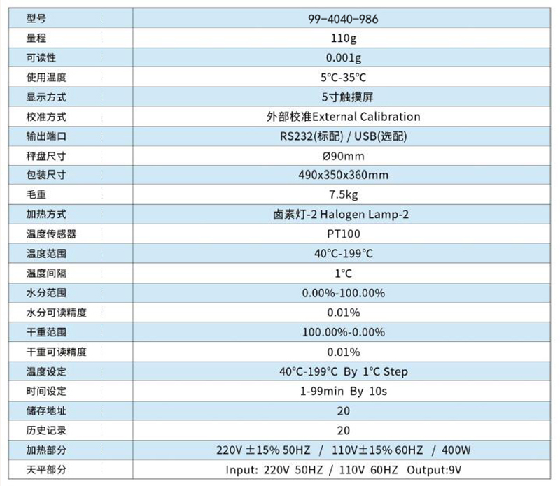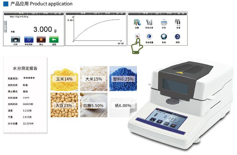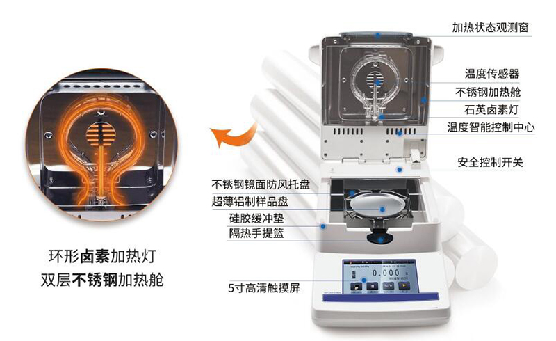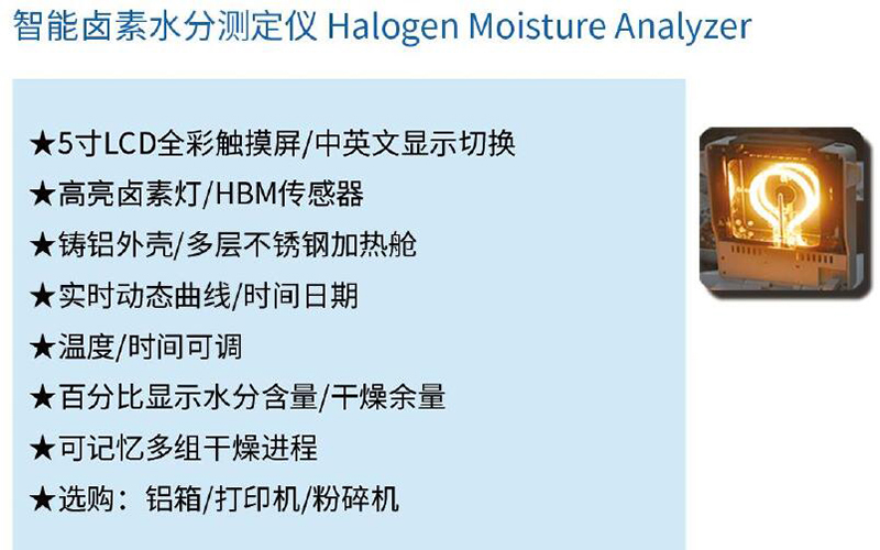 ·5寸LCD全彩触摸屏/中英文显示切换 ·高亮卤素灯/HBM传感器 ·铸铝外壳/多层不锈钢加热舱 ·实时动态曲线/时间日期 ·温度/时间可调 ·百分比显示水分含量/干燥余量 ·可记忆多组干燥进程 ·选购:铝箱/打印机/粉碎机
