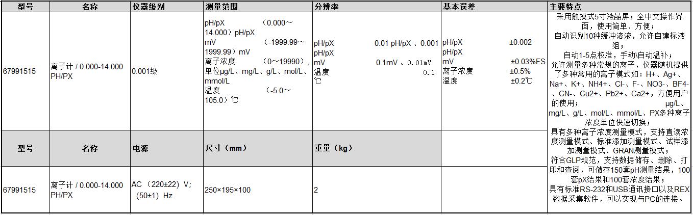 B17548 67991514 pH/pX(-2.000~20.000)pH;(0.000~14.000)pX mV值(-1999.9~1999.9)mV 离子浓度(0~19990);可选单位:pX、mol/L、mmol/L、g/L、mg/L、μg/L 温度值(-5.0~130.0)℃ pH/pX值0.001pH/pX mV值0.01mV 离子浓度四位有效数字(科学计数法表示) 温度值0.1℃ 0.001级 pH/pX值±0.002pH/pX mV值±0.03%FS 离子浓度±0.3% 温度值±0.1℃ 直流通用电源适配器(9VDC,800mA,内正外负) 280×280×130mm 2.5KG 44195.54