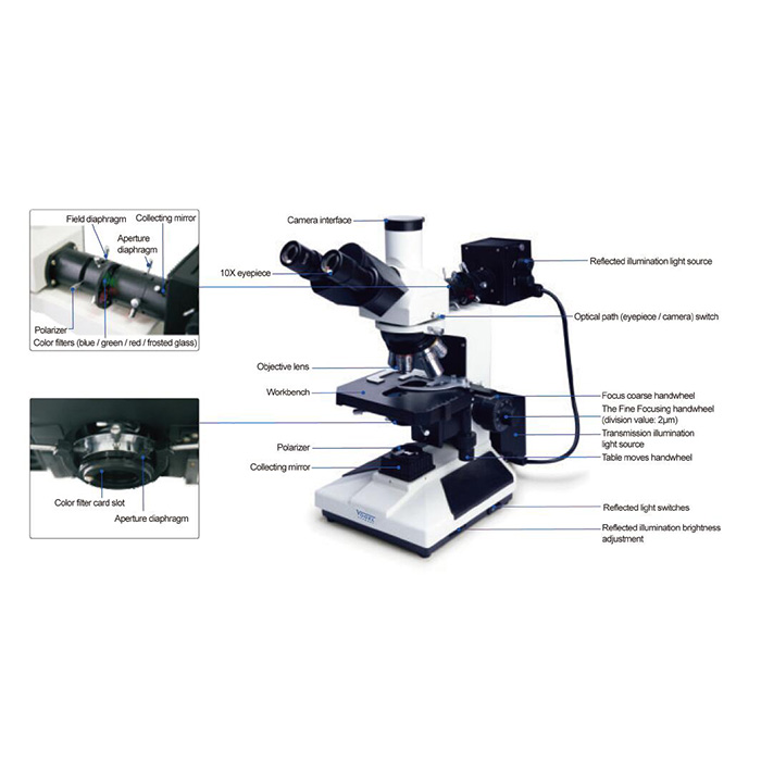 ·技术参数 ·用于:金相分析和高倍率显微观察 ·透射照明和反光照明可同时工作 ·40X,100X弹簧型物镜,避免碰撞损伤 ·标准配置 1台一主机 1台一防尘罩 3片一滤色片(蓝色/绿色/黄色)