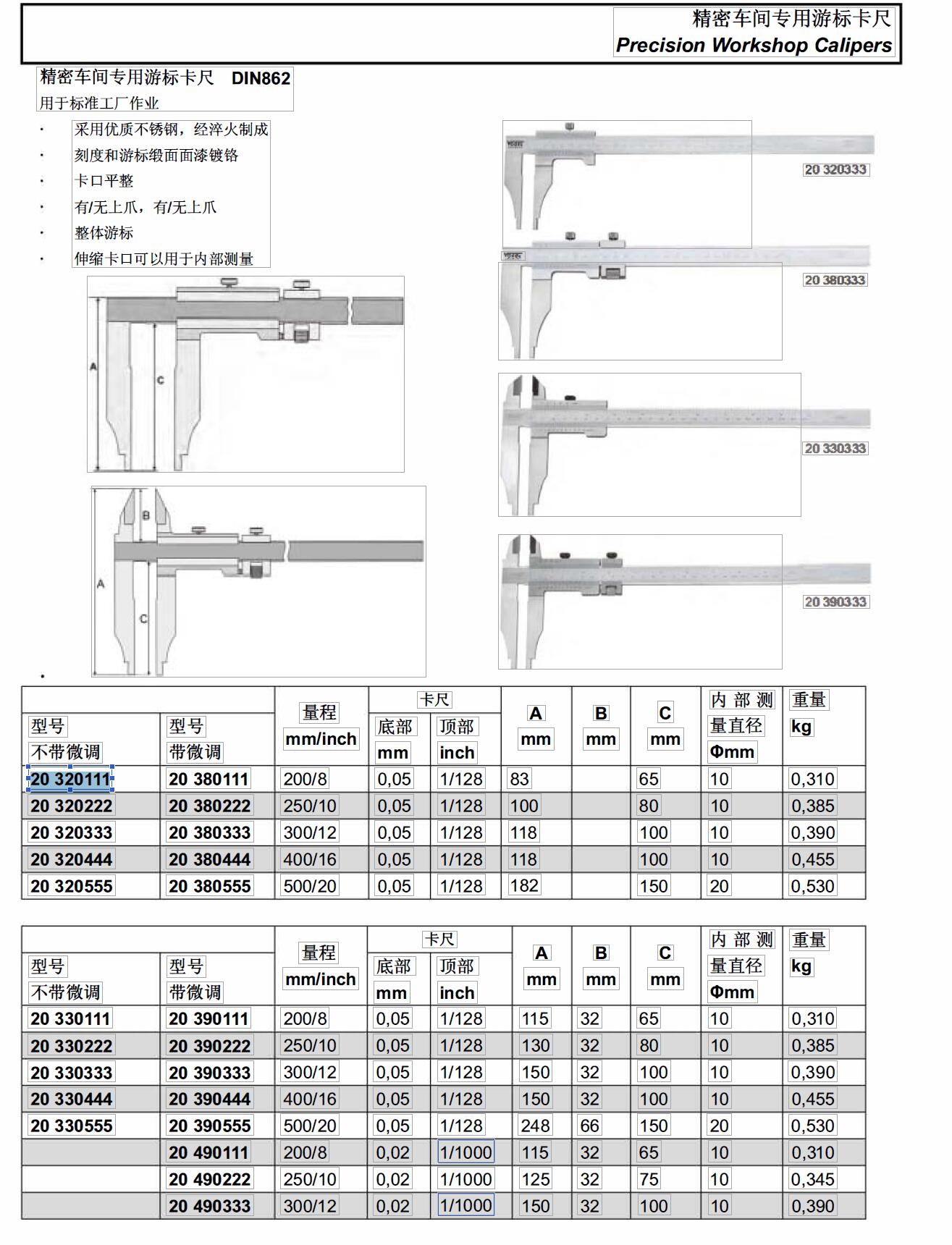 ·不锈钢制造,淬硬,刻度和游标缎面面漆镀铬