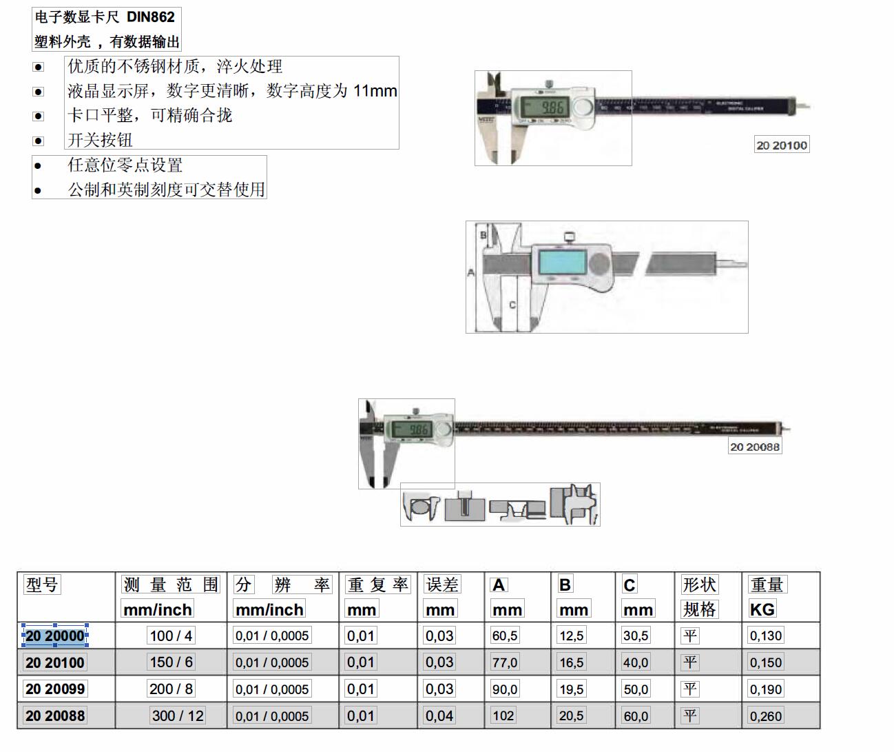 ·电子数显卡尺碳玻璃纤维 清晰的液晶显示清晰的液晶显示 ·自动开关功能, 任意位零点设置自动开关功能, 任意位零点设置