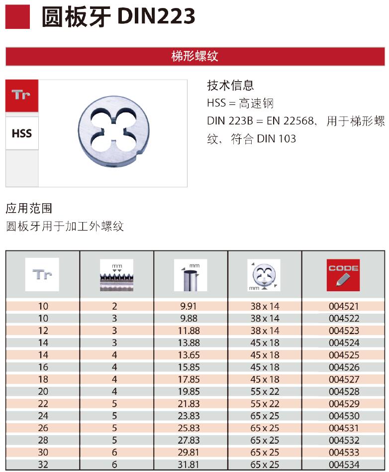 ·经久耐用,产品物美价廉 ·技术信息:HSS=高速钢 DIN 223B=EN 22568,用于梯形螺纹,符合DIN 103