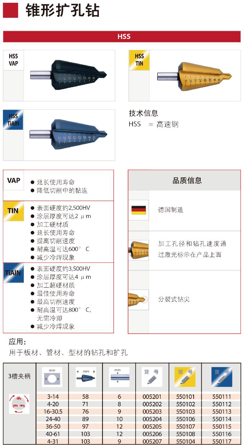 ·材质:HSS;延长使用寿命; ·降低切削中的黏连 ·德国制造; ·加工孔径和钻孔速度通过激光标示在产品上; ·分裂式钻尖