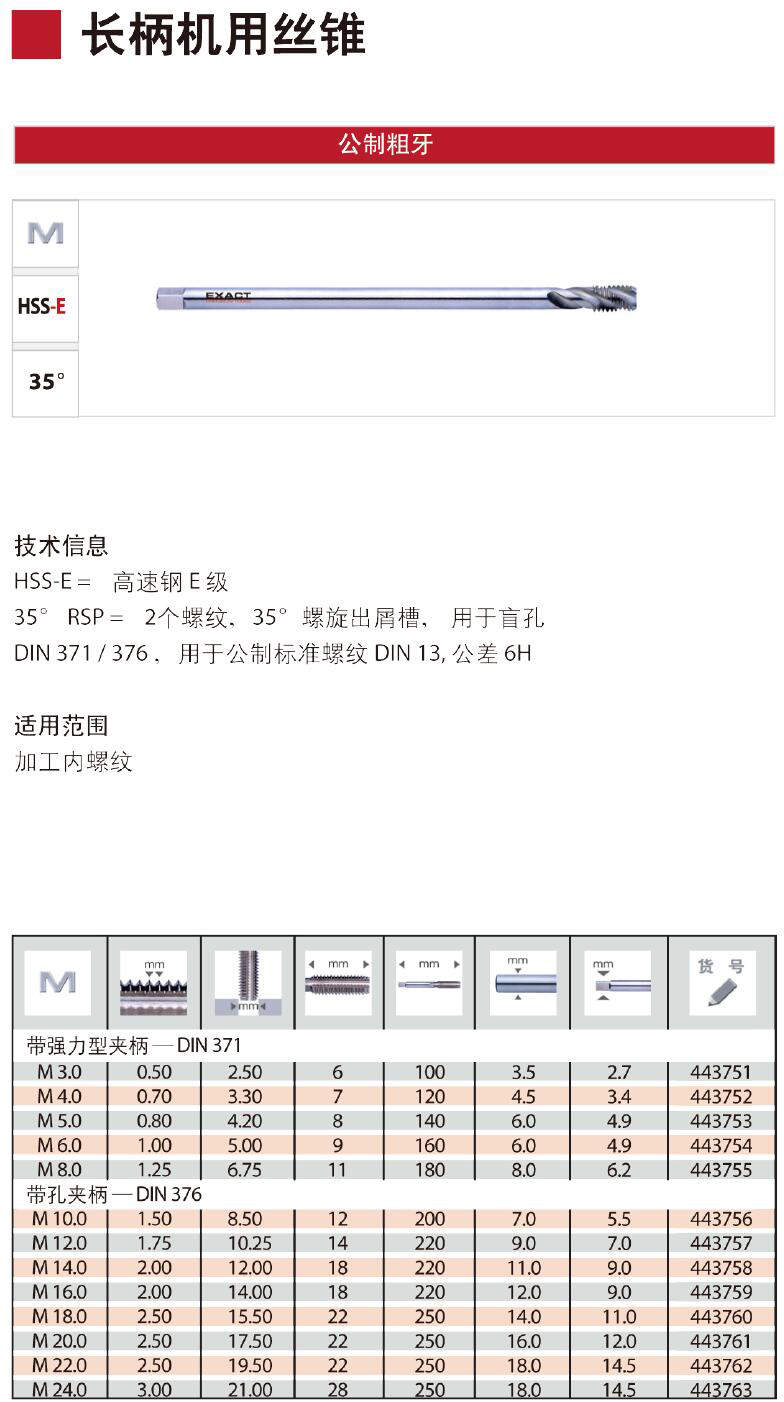 ·材质:HSS-E;2个螺纹,35︒螺旋出屑槽,用于盲孔;用于加工内螺纹