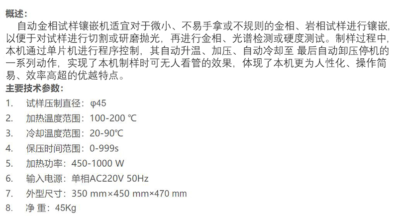 ·自动金相试样镶嵌机适宜对于微小、不易手拿或不规则的金相、岩相试样进行镶嵌,以便于对试样进行切割或研磨抛光,再进行金相、光谱检测或硬度测试。制样过程中,本机通过单片机进行程序控制,其自动升温、加压、自动冷却至最后自动卸压停机的一系列动作,实现了本机制样时可无人看管的效果,体现了本机更为人性化、操作简易、效率高超的优越特点。