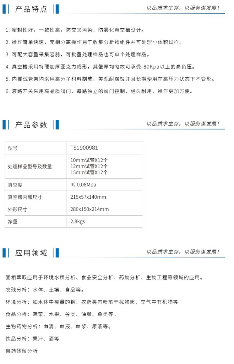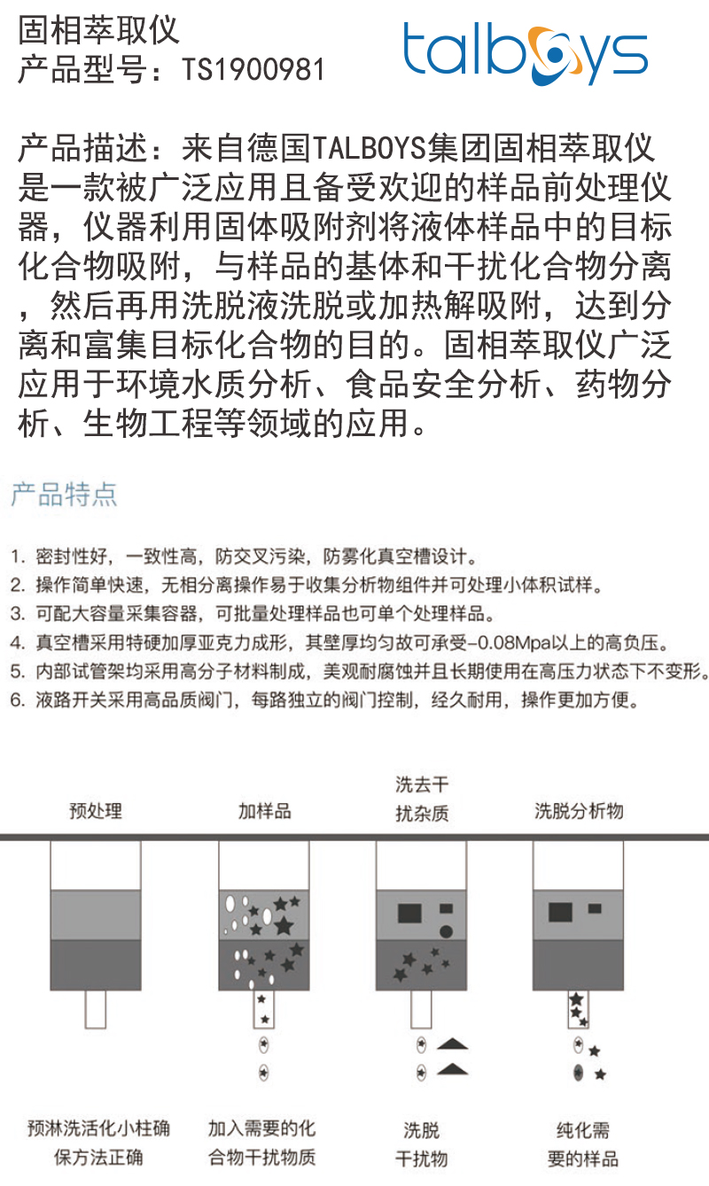 ·固相萃取仪是一款被广泛应用且备受欢迎的样品前处理仪器,仪器利用固体吸附剂将液体样品中的目标化合物吸附,与样品的基体和干扰化合物分离,然后再用洗脱液洗脱或加热解吸附,达到分离和富集目标化合物的目的。固相萃取仪广泛应用于环境水质分析、食品安全分析、药物分析、生物工程等领域的应用。