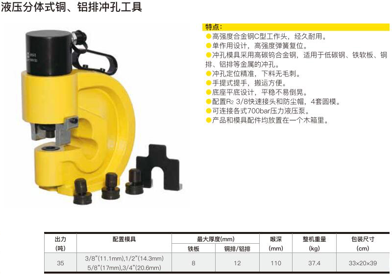 ·高强度合金钢C型工作头,经久耐用。 ·单作用设计,高强度弹簧复位。 ·冲孔模具采用高碳钨合金钢,适用于低碳钢、铁软板、铜排、铝排等金属的冲孔。 ·冲孔定位精准,下料无毛刺。手提式提手,搬运方便。 ·底座平底设计,平稳不易倒晃。 ·可连接各式700bar压力液压泵。 ·产品和模具配件均放置在一个木箱里。