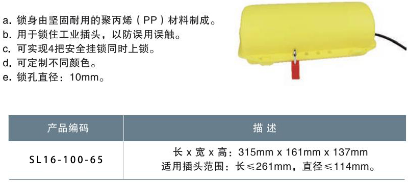 ·锁身由坚固耐用的聚丙烯(PP)材料制成 ·用于锁住工业插头,以防误用误触 ·可实现4把安全挂锁同是上锁 ·可定制不同颜色 ·锁孔直径:10mm