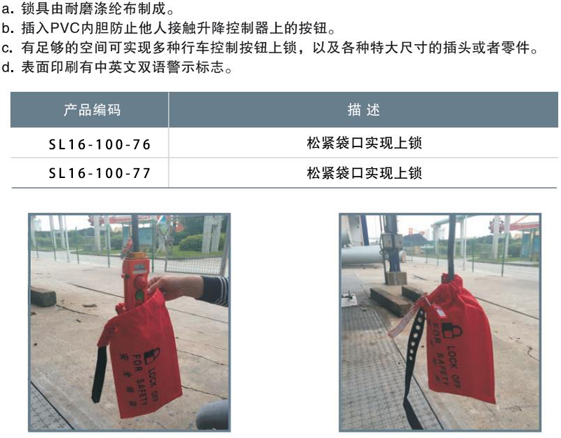 a.锁具由耐磨涤纶布制成。 b.插入PVC内胆防止他人接触升降控制器上的按钮。 c.有足够的空间可实现多种行车控制按钮上锁,以及各种特大尺寸的插头或者零件。 d.表面印剧有中英文双语警示标志。