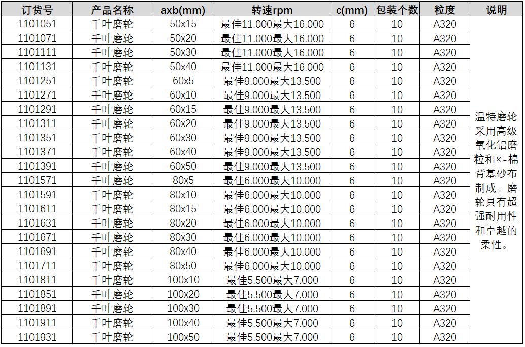 ·温特磨轮采用氧化铝磨粒和×-棉背基砂布制成。磨轮具有超强耐用性和的柔性。