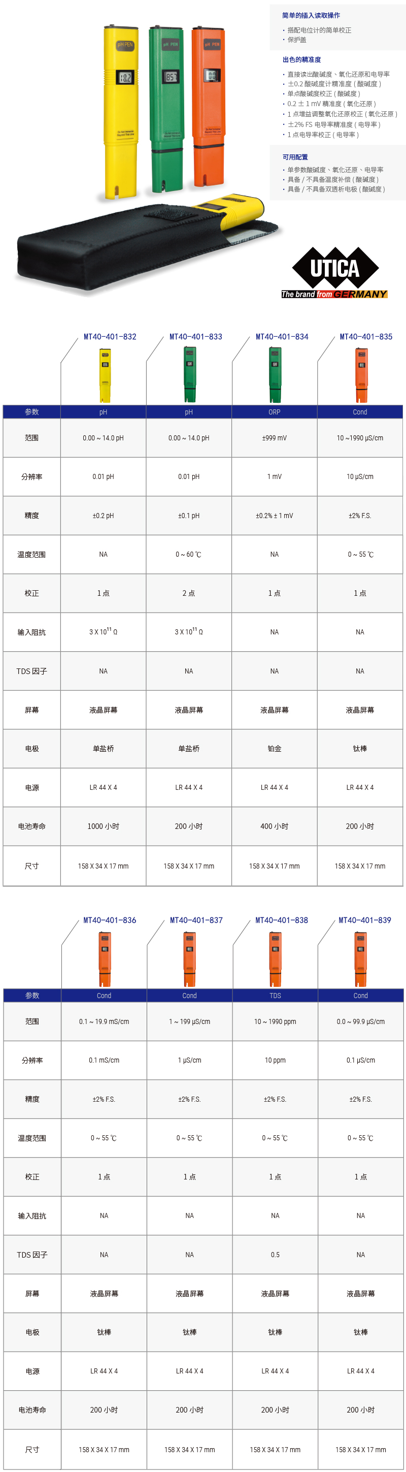 双参数酸碱度与电导率;自动温度补偿(酸碱度);双范围:自选式或自动调整范围选项(氧化还原);52组内存储存 |