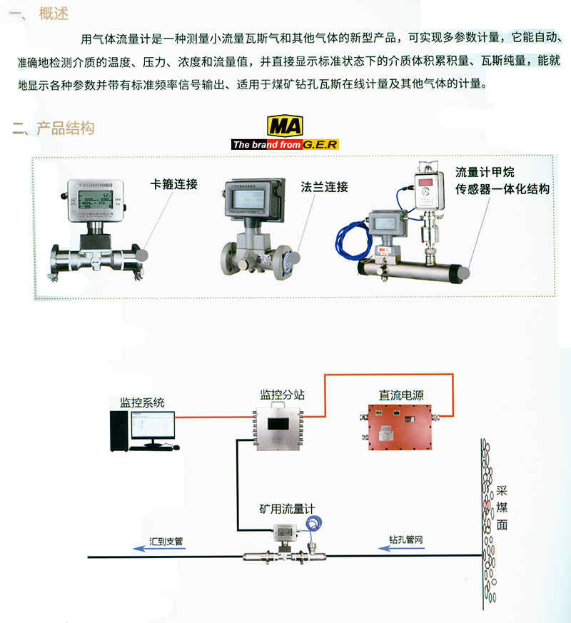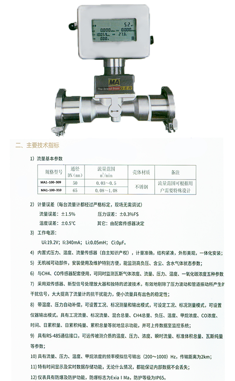 ·内置式压力、温度、流量传感器(自主知识产权),计量准确,结构紧凑,外形美观,一体化安装; ·无机械可动部件,安装使用及维护特别方便,能监测高负压、含尘、含水气体状态参数; ·与CH4、CO传感器配套使用,可同时监测瓦斯气体浓度、流量、压力、温度、一氧化碳浓度五种参数; ·双器型处理器和独特的波技术,有效地除了压力波动和管道振动所产生干扰信号,大大提高了流量计的抗干扰能力,使小流量具有出色的稳定性; ·带温度、压力自动补,可设置工况、标况测量和输出模式,可设定工况、标况测量模式,可设置仪器输出模式。具有工况流量、标况流量、混合总量、CH4总量、负压、温度、甲烷浓度、CO浓度、时间、日累积量、日累积纯量、累积总量等就地显示功能,并可上传数据至监控系统; ·具有RS-485通信接口,可远传被测介质的温度、压力、浓度、瞬时流量、标准体积总量、瓦斯纯量等参数; ·具有流量、压力、温度、甲烷浓度的频率模拟信号输出(200~1000)Hz,传输距离为2km; ·特有时间显示及实时数据存储功能,无论什么情况,都能保证内部数据不会丢失; ·仪表具有防爆及防护功能,防爆标志为ExiaIMa,防护等级为IP65。
