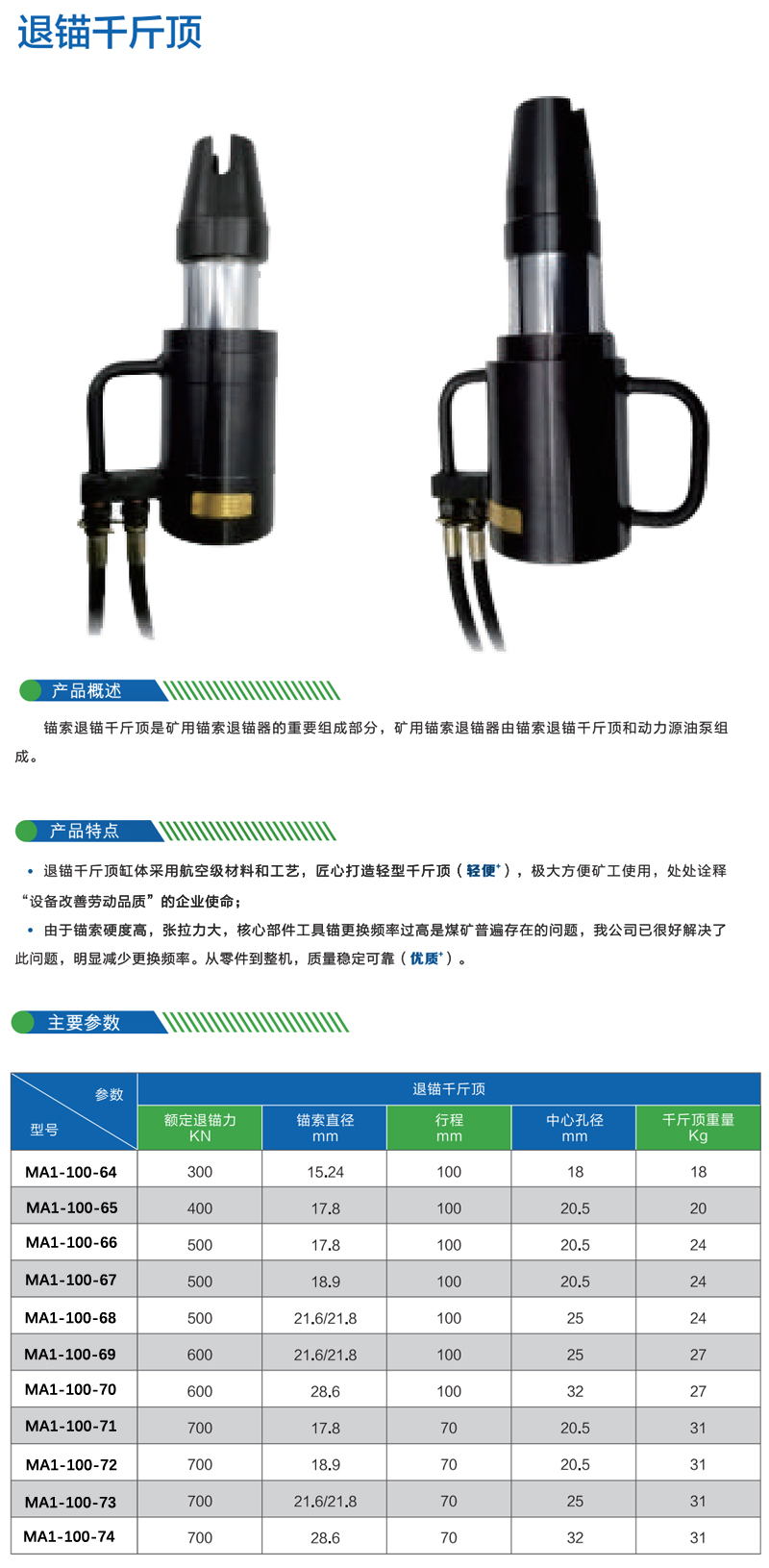 规格:  额定退锚力 600KN 制造商型号:  MA1-100-70